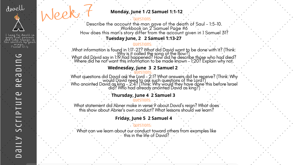 Thank you for joining the beautiful study of God’s Holy and life-changing word! Here are the readings for Week 7:)